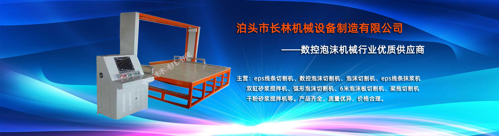 泊头市长林机械设备制造有限公司座落于河北省泊头市开发区,地处北京、天津、济南、石家庄中心位置。京沪高速、京沪铁路、106国道、104国道穿行于本市,交通便利。 本公司是集多功能数控泡沫切割机的自主研发、生产、销售和服务于一体的企业,eps线条设备,数控泡沫切割机,发泡陶瓷切割机,eps线条切割机销往全国各地,并开辟了国际合作的广阔渠道。创新不断的长林数控机械有限公司经过几年的不断研究,完善了建筑装饰构件的配套设备和自动化设备,由过去手工生产到半自动生产发展到现在的CNC控制的全自动零误差数控泡沫切割机床。不但让客户在交货期上面争取了时间而且···